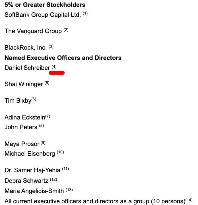 For example, if we zoom in, we can see CEO, Daniel Schreiber has footnote (4). So for full details of his share ownership, we should read that footnote, which immediately follows.