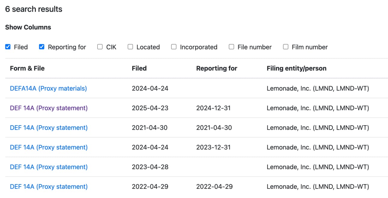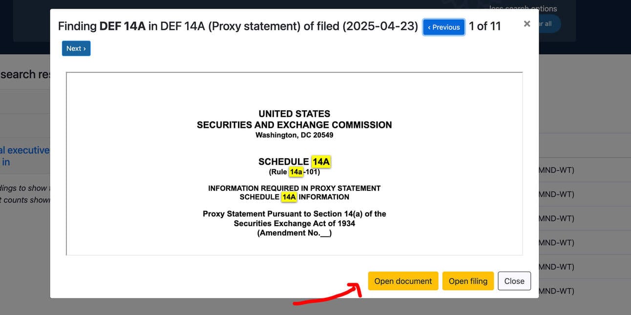 You now have the below list of DEF 14A filings. Select the most recent one that says “proxy statement” and click “open document”.