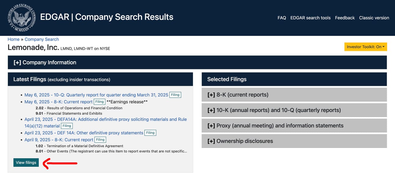 You should now see the company’s SEC page. From here, click “view filings”