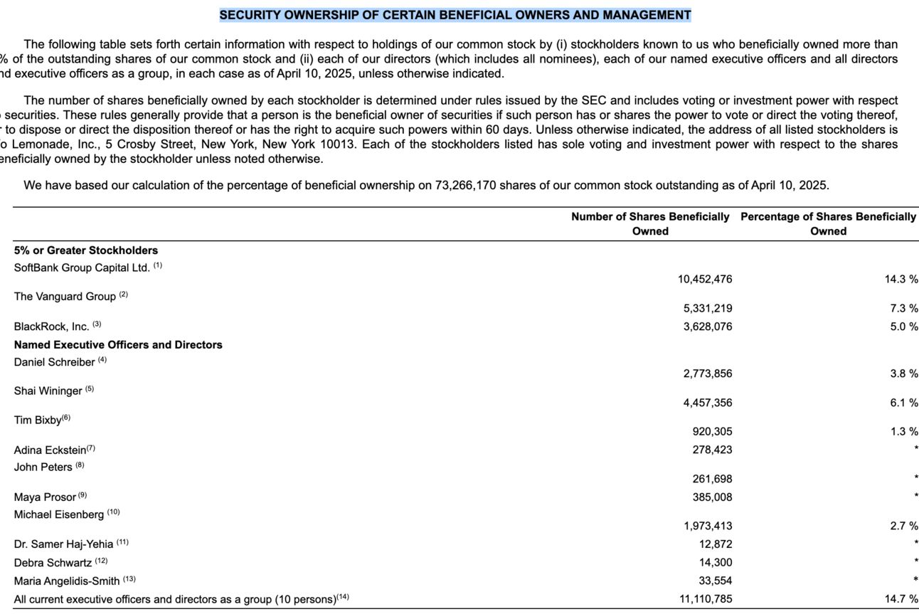 And now we have total share counts of the C-Suite! Above you can see share ownership by Daniel Schreiber, Shai Winniger, Tim Bixby, etc… share ownership of the business Lemonade, Inc.