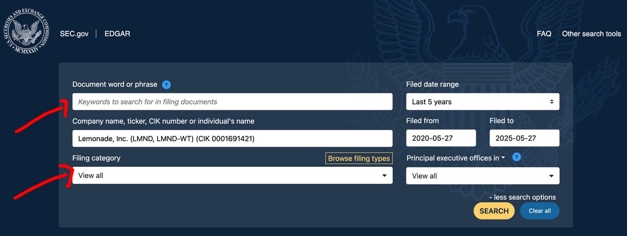 From here, type in "DEF 14A” in the keywords search option. The DEF 14A is a filing that contains a list of management and how many shares they own.