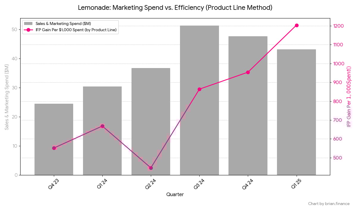 Below is a chart I made showing the amount of estimated $IFP gain per $1,000 spent on Sales & Marketing. The way I calculated this looks specifically at policy growth, so as to exclude gains simply from rate hikes.